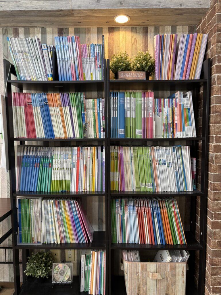 ずらっと教材が並んだ本棚は圧巻です!教科書や参考書も完備しているので、分からない問題がある時には、先生に質問する前に、まずは自分で調べようとする生徒が多いです。
