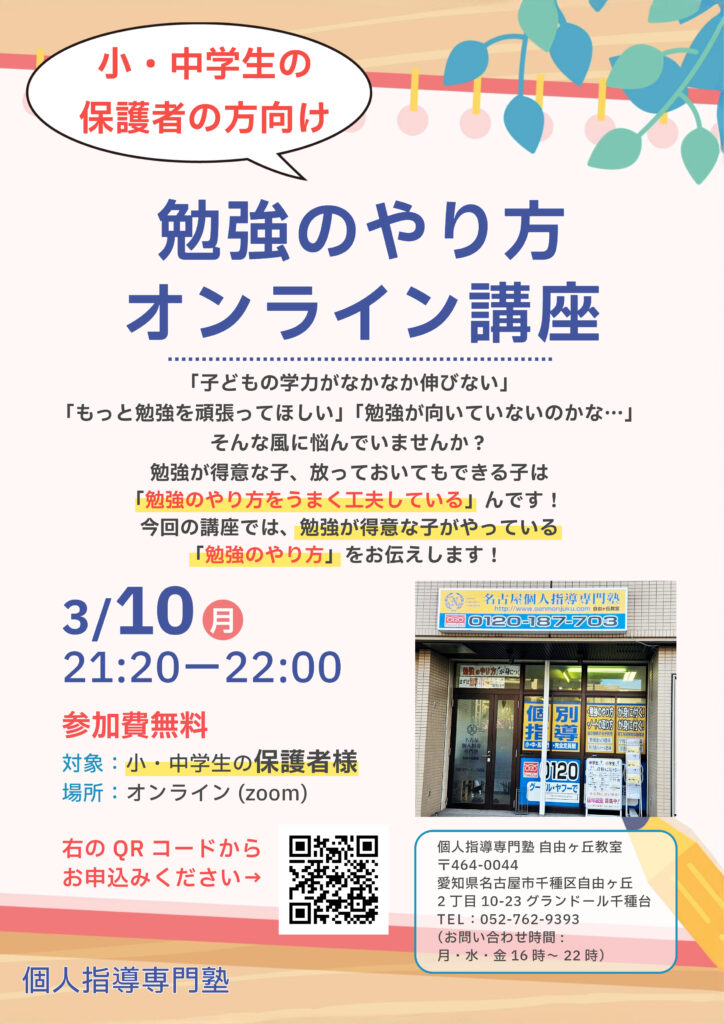 そんなお悩みを解決するため、この度、保護者様向けに「勉強のやり方オンライン講座」を実施することに致しました。