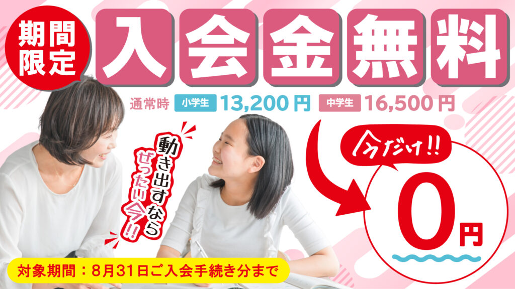 個人指導専門塾では、期間限定で「入会金無料キャンペーン」を実施いたします。